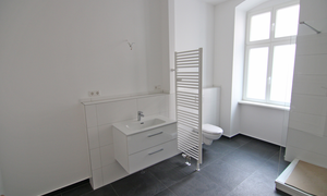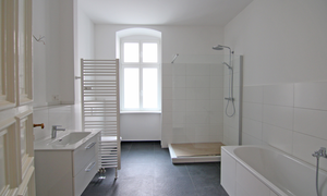 Der in der Wohnung vorhandene Stuck ist atemberaubend - er wurde akribisch aufgearbeitet. Die historischen Dielen wurden sorgfältig geschliffen, sie schaffen ein wohnliches, altbautypisches Ambiente. Auch die Sanitärausstattung ist komplett neu entstanden: das Hauptbadezimmer ist sehr geräumig gehalten, hier finden eine Badewanne und auch eine große Dusche Platz. Ein Fenster im Bad ist natürlich vorhanden. Weiter gibt es ein praktisches, ebenso komplett neues Gäste-WC im Bereich des Wohnungseingangs. Die Elektrik ist komplett neu, zeitgemäßen Wohnkomfort schaffen überdies die aufwändig gespachtelten Wände. Eine Einbauküche ist derzeit noch nicht vorhanden, hierzu können wir bestimmt  ins Gespräch kommen - und eine Lösung finden. Die Beheizung erfolgt über Fernwärme.